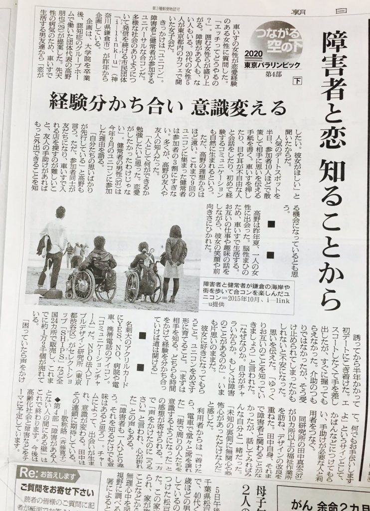 『恋せよ!ジンルイ』『どうせ出会えない、をなくす』というキャッチフレーズで親しまれているユニバーサル合コンに対する、朝日新聞の記事です。